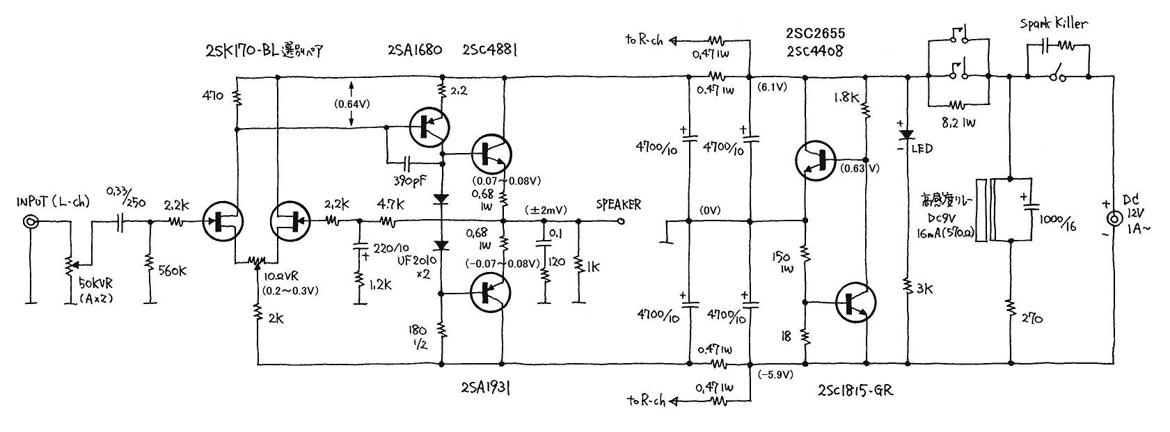 ぺるけ氏のトランジスタ式ミニワッターの特徴のひとつに、仮想グランド電源を使っていることがあります。