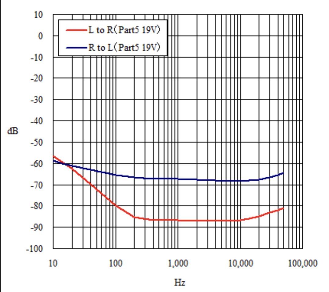 この図はトランジスタ式ミニワッターPart5のクロストーク測定結果で、あえてライン入力のグランドポイントをズラしして測定した結果だそうです。