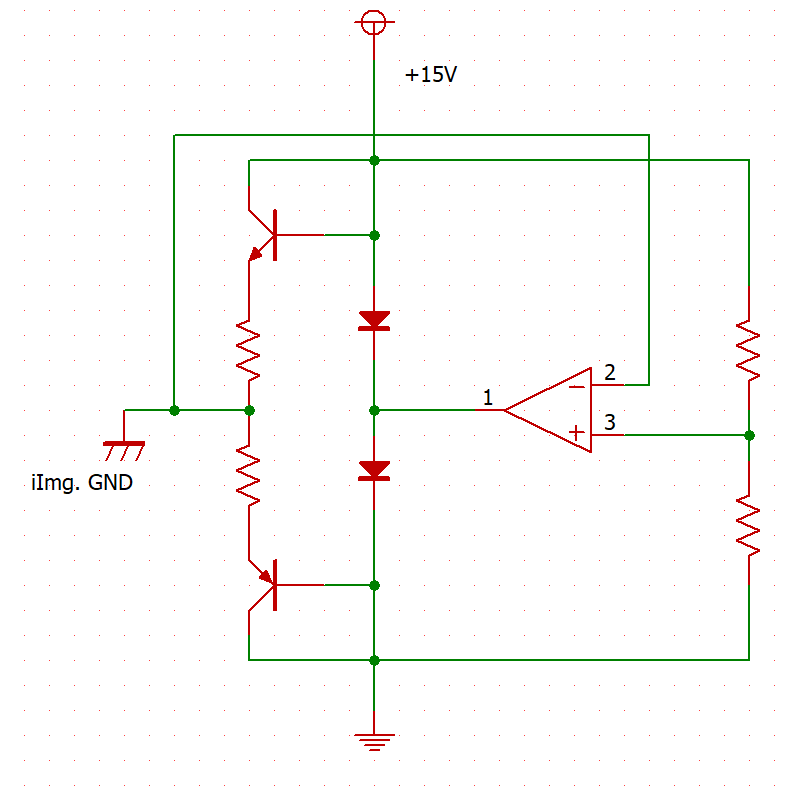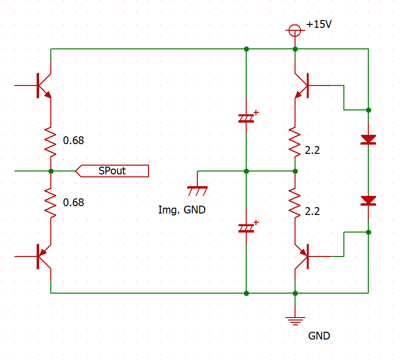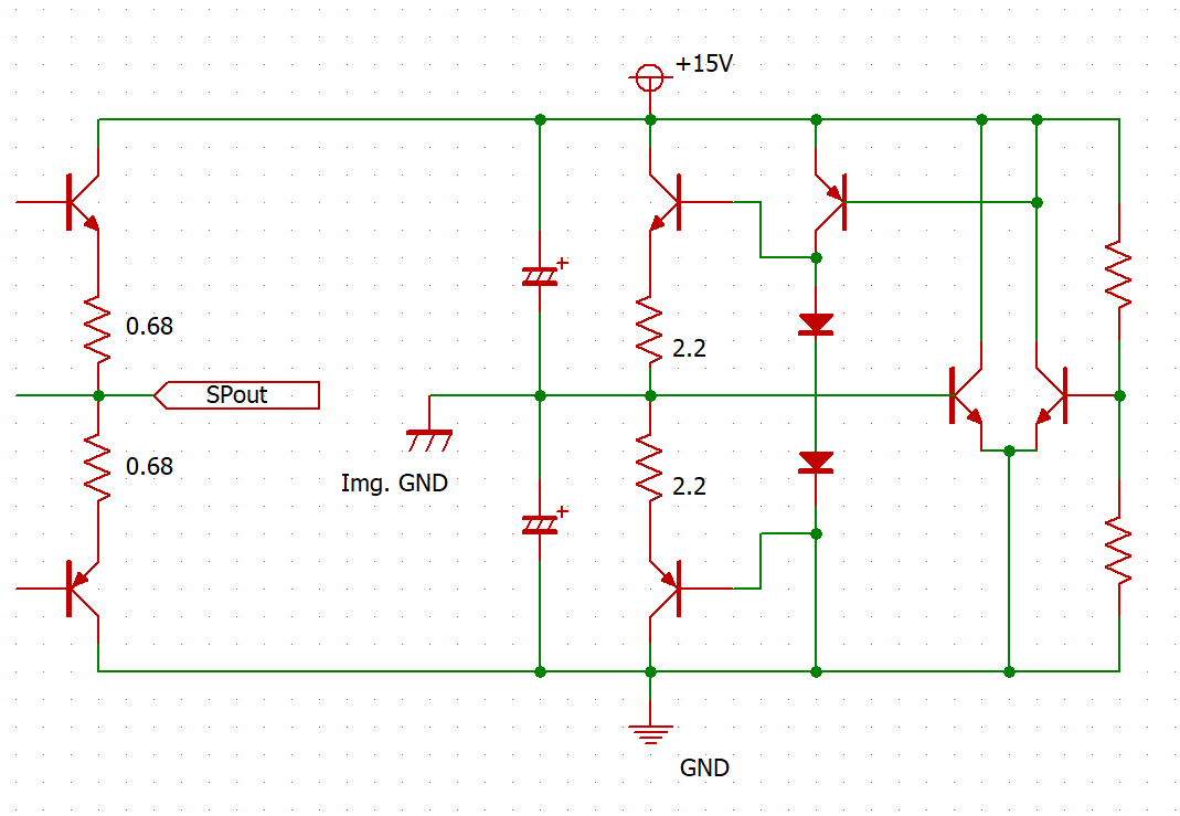 この回路をもうちょっとわかりやすく簡略化して表現するとこちらのようになります。 オペアンプのボルテージフォロアをSEPPでバッファしたものと考えることができます。このような仮想グランドをオペアンプでつくるところを、ディスクリートで構成したら、NFBの良い面が全面に出てきてすごかったという記事になります。